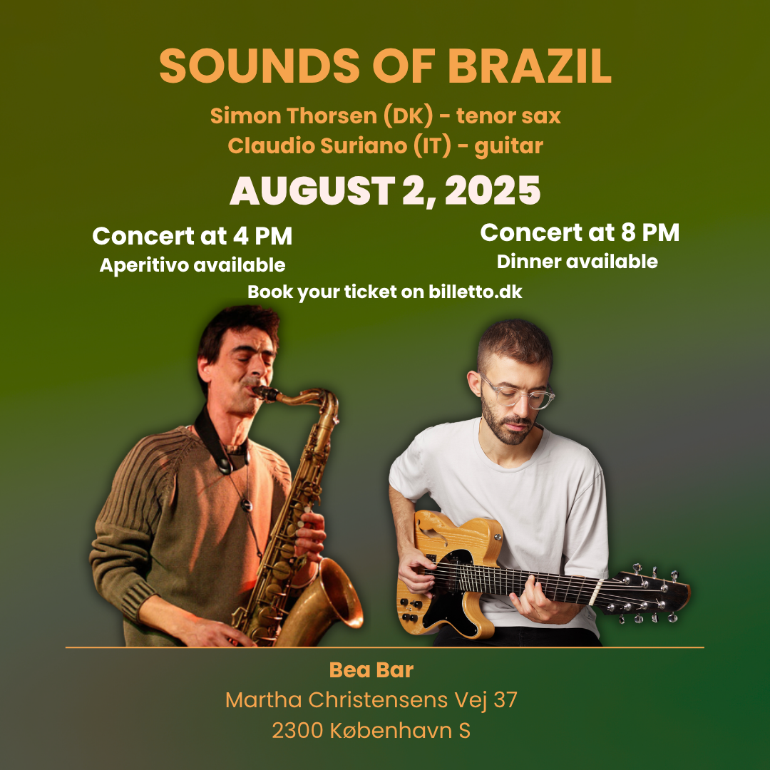 Join us on Saturday, August 2 for a charming evening featuring the melodious strains of bossa nova brought to life by the incredible Simon Thorsen on tenor sax and Claudio Suriano on guitar.
